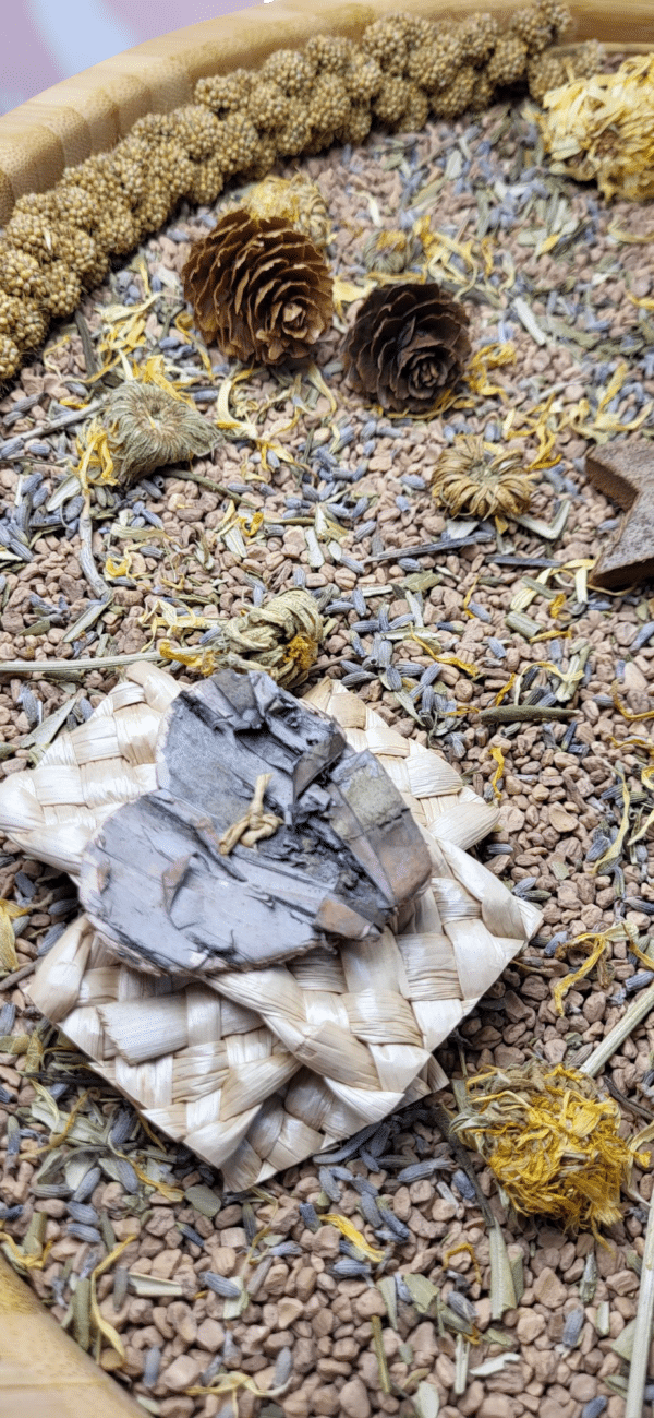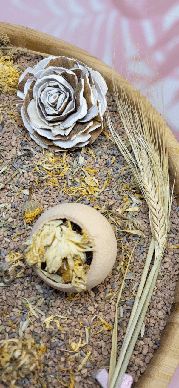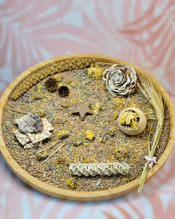 Panay es sinónimo de calma, belleza y exploración. Esta bandeja combina ingredientes vegetales con aromas suaves como la lavanda y la caléndula, en un lecho de huesillo granulado, que invita a la búsqueda activa y natural.