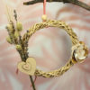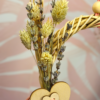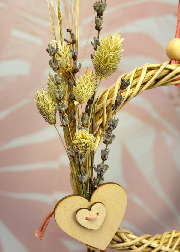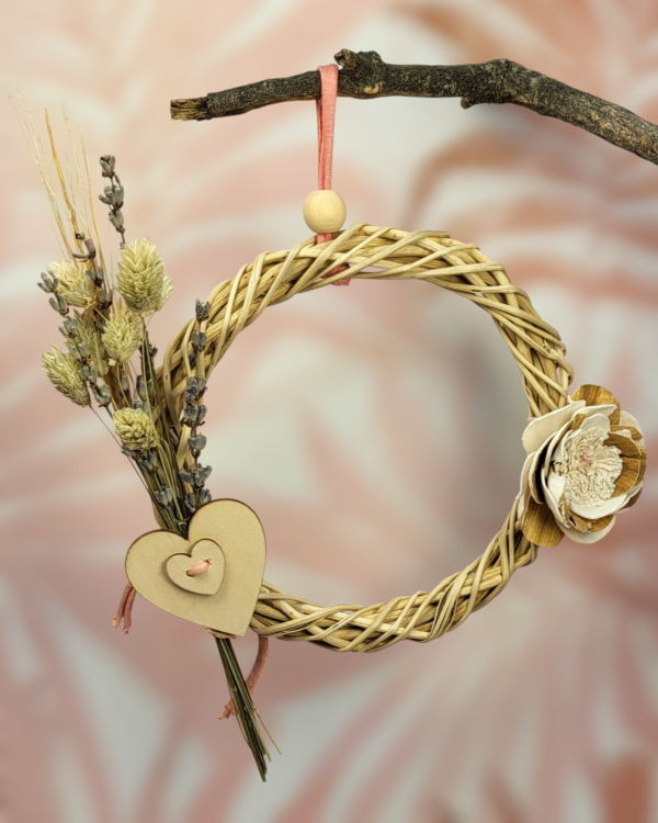 En uno de sus lados incorpora un pequeño ramillete compuesto por alpiste, lavanda y cebada, que aporta interés sensorial y fomenta el forrajeo suave. En el otro, una flor de yuca pequeña de 5 cm completa la composición y añade una textura irresistible para picotear. Como unión decorativa y estructural, un corazón de madera de haya aporta firmeza y encanto.