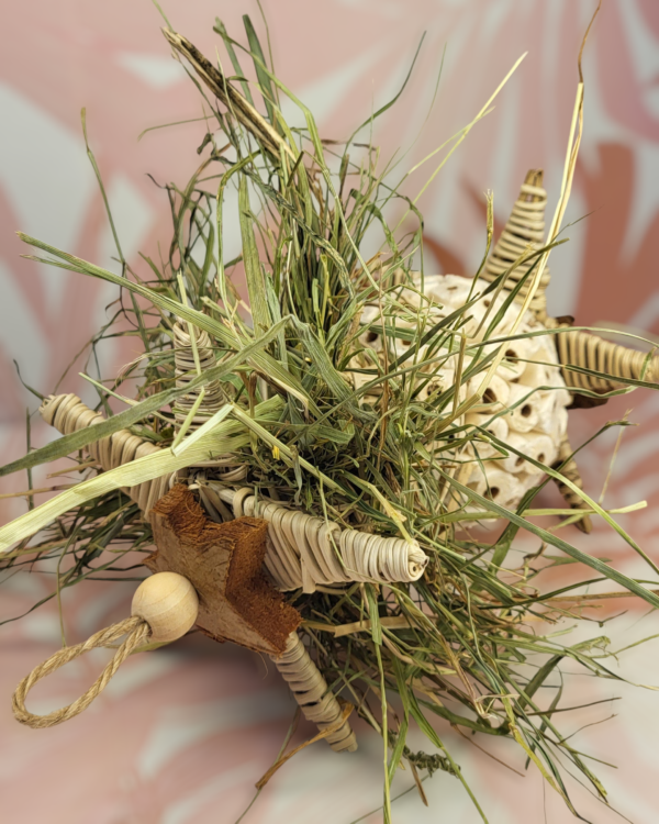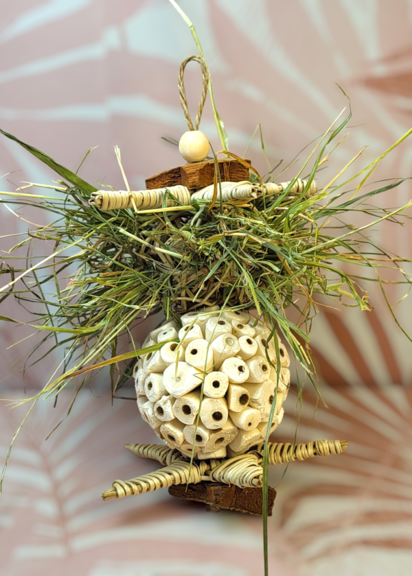 Es una pieza muy interesante porque combina destrucción, manipulación y forrajeo ligero, permitiendo que el loro interactúe con distintas texturas y densidades. El ratán invita a investigar, el coco aporta dureza y fibras, el heno despierta el interés olfativo y es perfecto para esconder semillas y la yuca añade ese punto altamente destructible que suele gustar tanto.