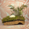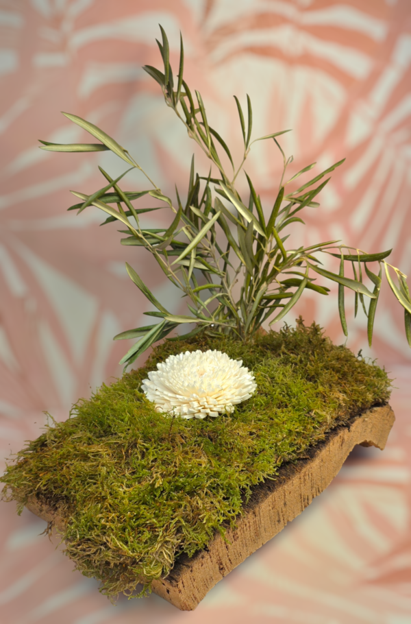 Sobre ella una capa de musgo natural, de la que brota un ramillete de olivo ecológico seco y una flor de yuca, creando un punto de interés irresistible para tu loro.Cada elemento ha sido elegido para estimular el forrajeo, la exploración y el comportamiento natural del ave, ofreciendo una experiencia rica en texturas, aromas y sensaciones.