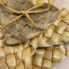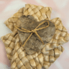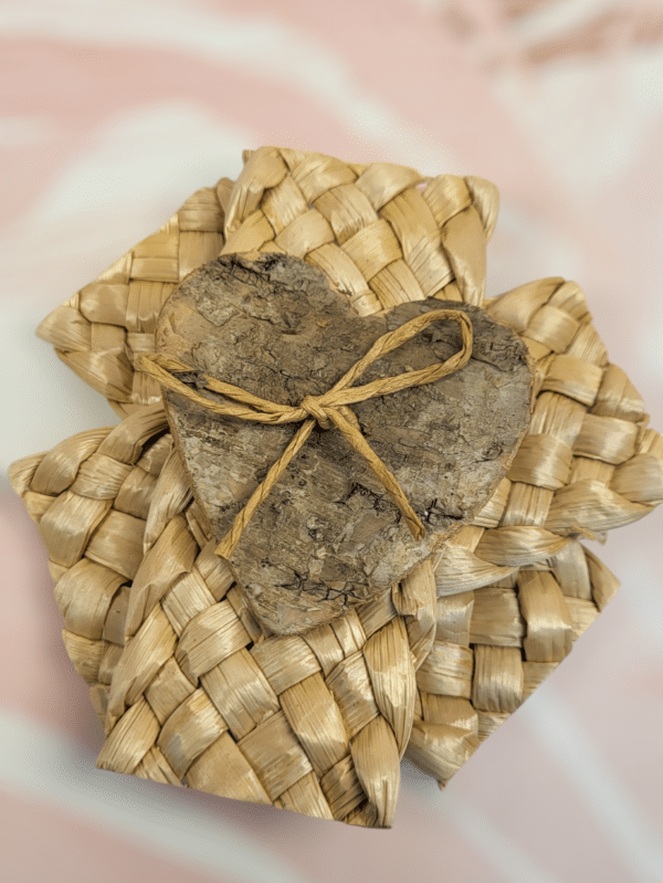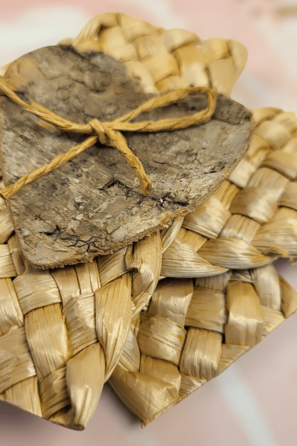 Materiales: Trenzado de hoja de maíz con un corazón de abedul en el centro, unido con cuerda de rafia.