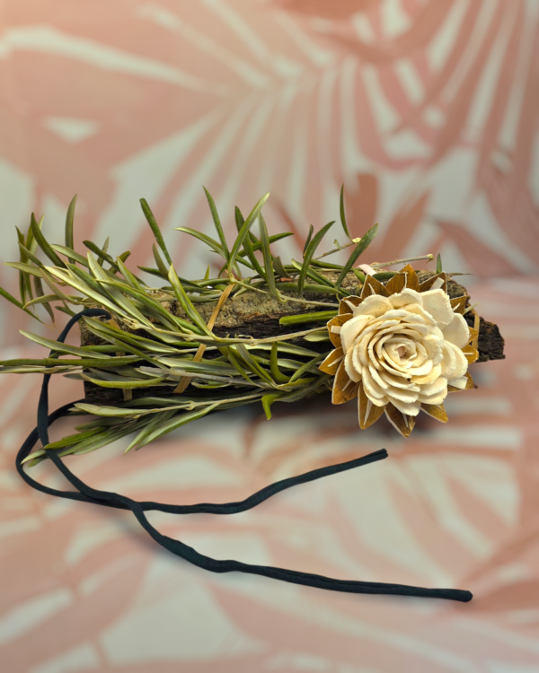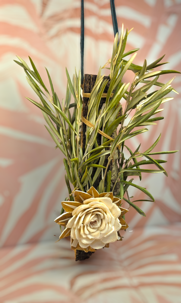 Este juguete colgante está elaborado sobre una pieza de corcho natural, de entre 20 y 25 cm, decorada cuidadosamente con ramitas de olivo ecológico que rodean la estructura y una flor de yuca en la parte frontal.