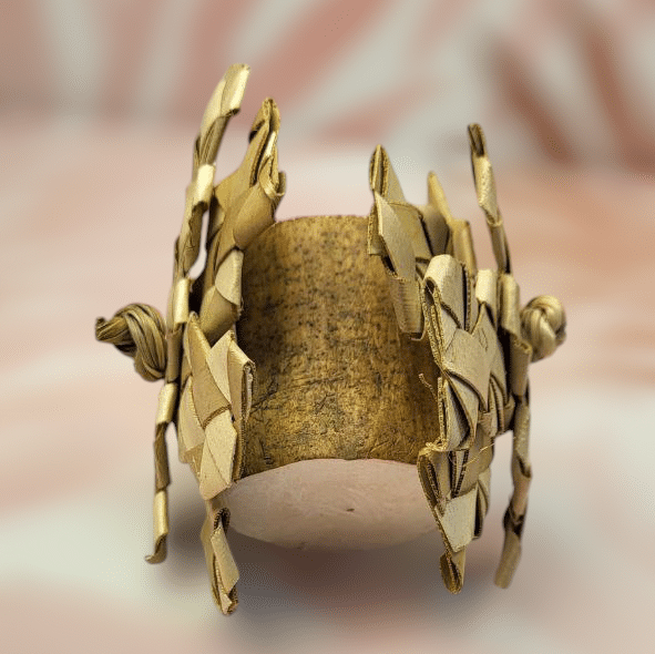 Materiales: Tronquito de yuca y trenzado de hoja de palma, ensamblado con cuerda marina.