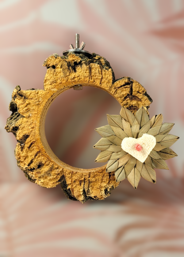Posadero elaborado con rodaja natural de corcho de alcornoque, ideal para ofrecer un punto de descanso natural dentro de la jaula.
