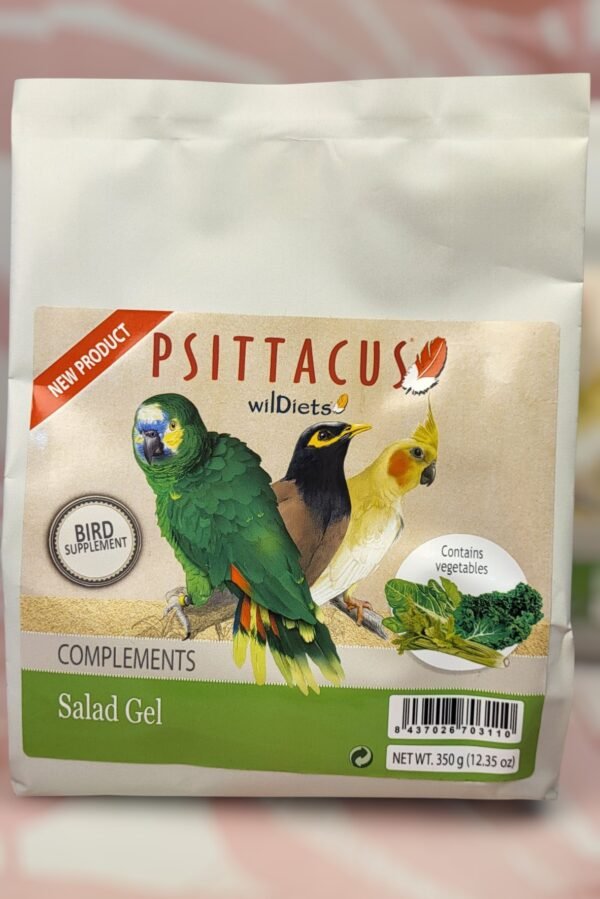 El Psittacus Salad Gel es un alimento complementario en polvo que, al mezclarse, forma un gel sólido nutritivo y apetente.