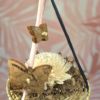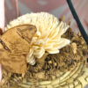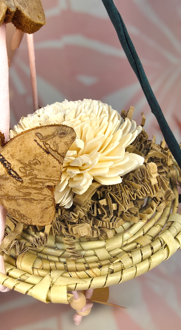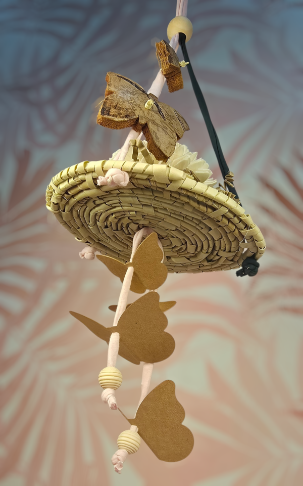 La base de palma natural se convierte en un pequeño escenario de exploración gracias al papel rizado y la flor de yuca blanca, mientras que los elementos colgantes aportan movimiento, curiosidad y juego visual.